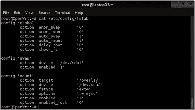Теперь нам необходимо расширить файловые разделы, так как на самом устройстве свободного места практически нет. Для этого, вносим в файл /etc/config/fstab следующие изменения:
